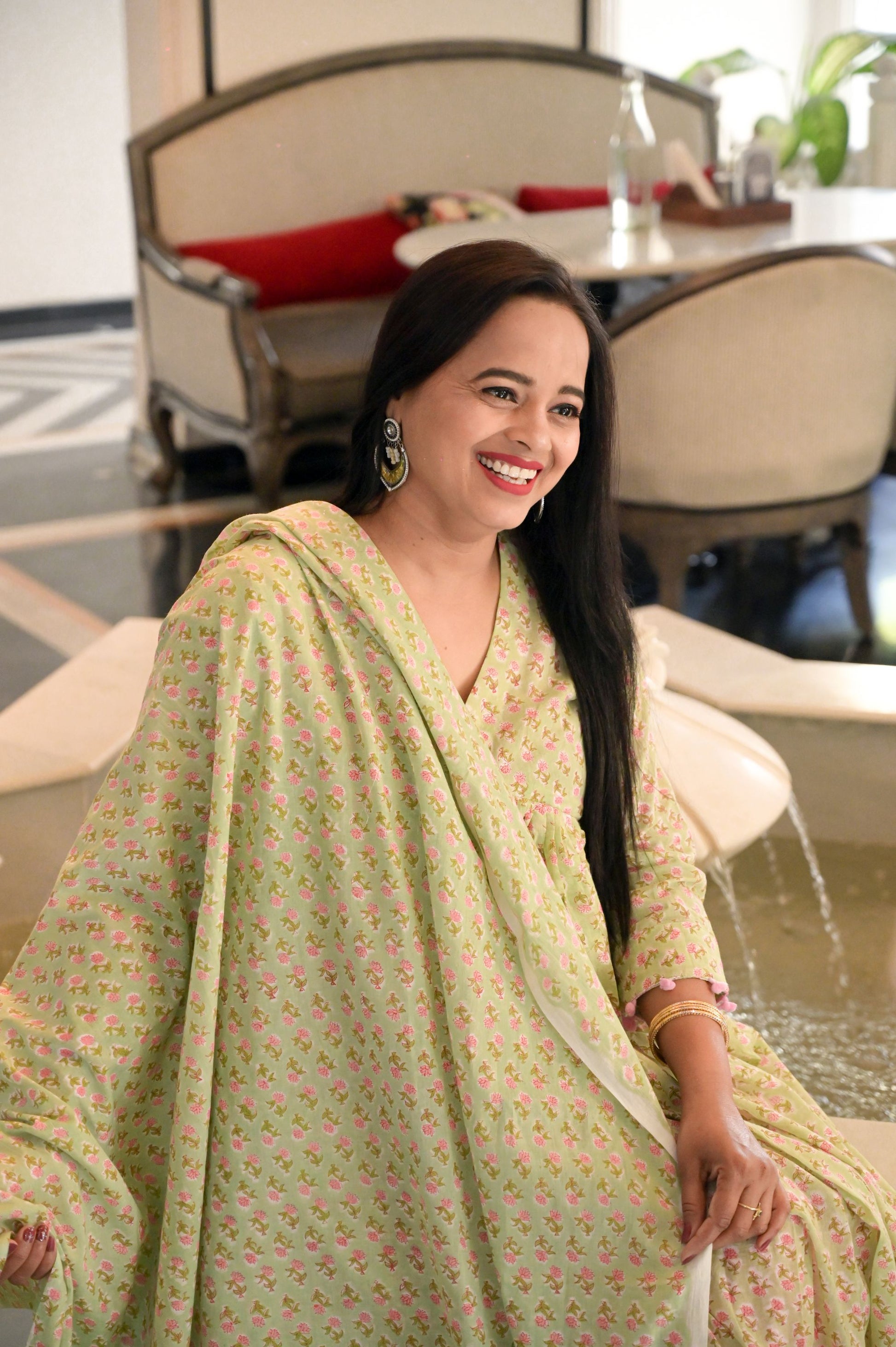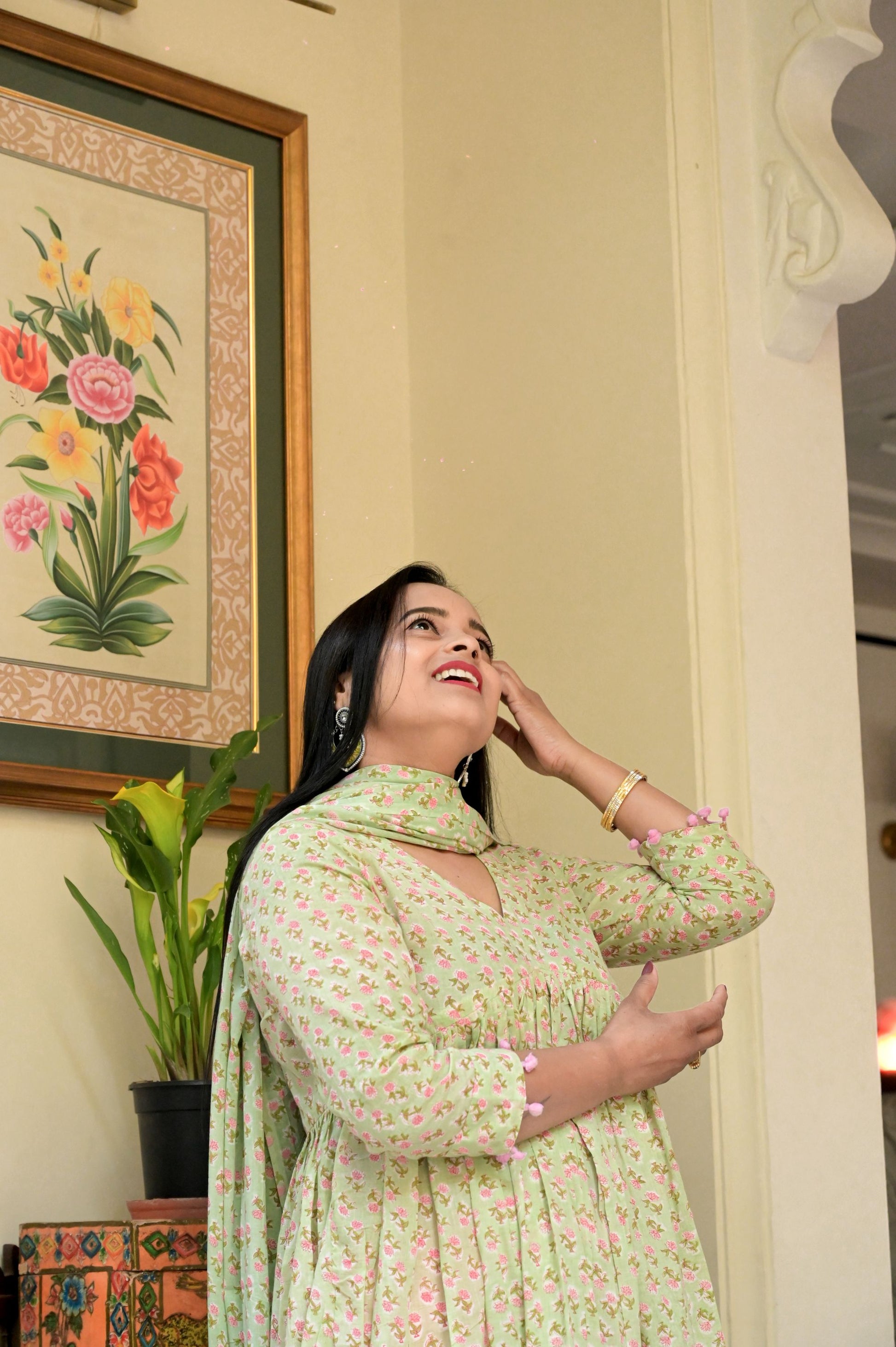 Gulabo Pista Green Handblock Mulmul Flared Suit Set