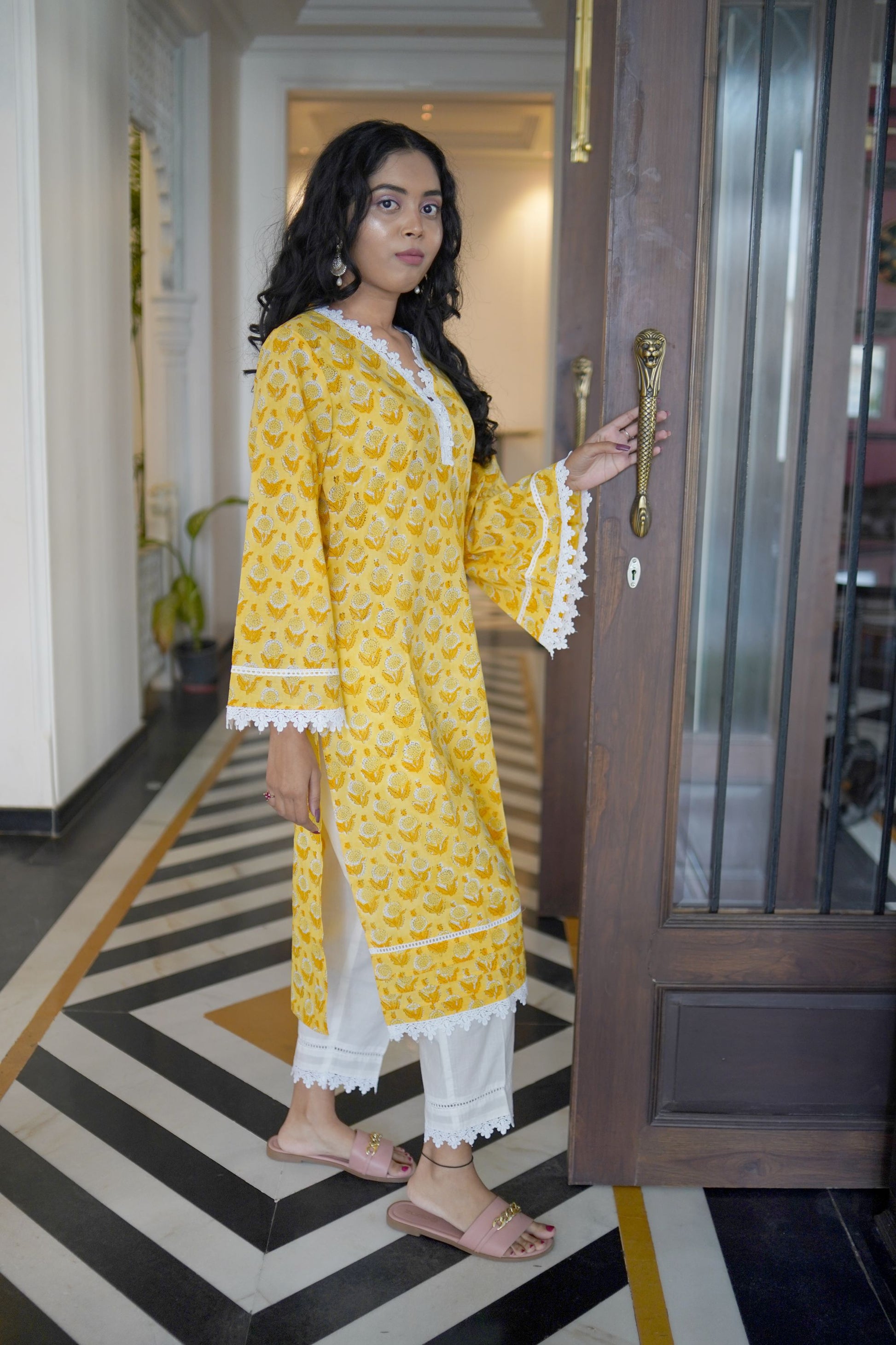 Product Details- The Seher Yellow Handblock Kurta showcases a beautiful yellow sanganeri handblock kurta with trendy flared sleeves stitched in a straight silhouette .The kurta has beautiful detailed crochia lace work. This kurta is super trendy and comfortable to wear . The colour of this kurta will surely brighten up your day.