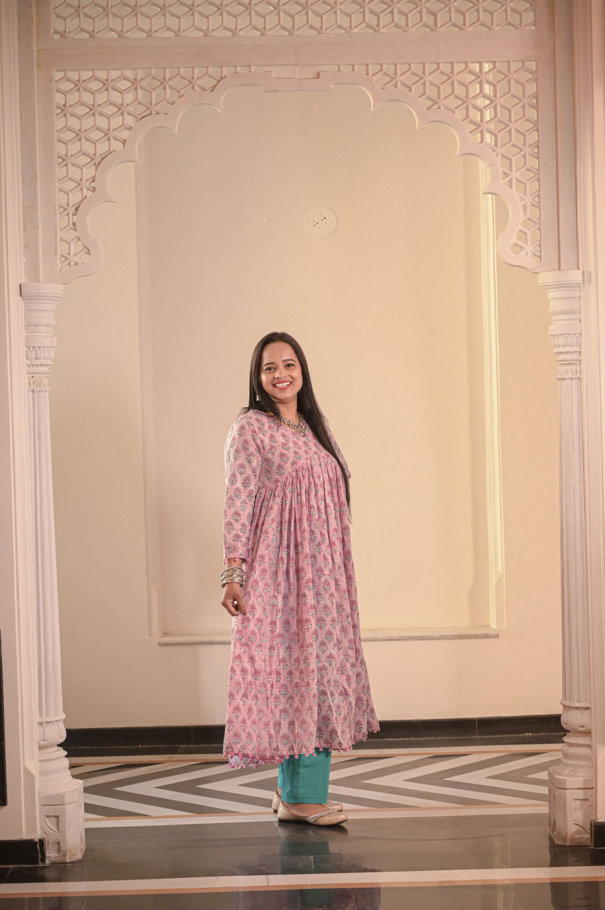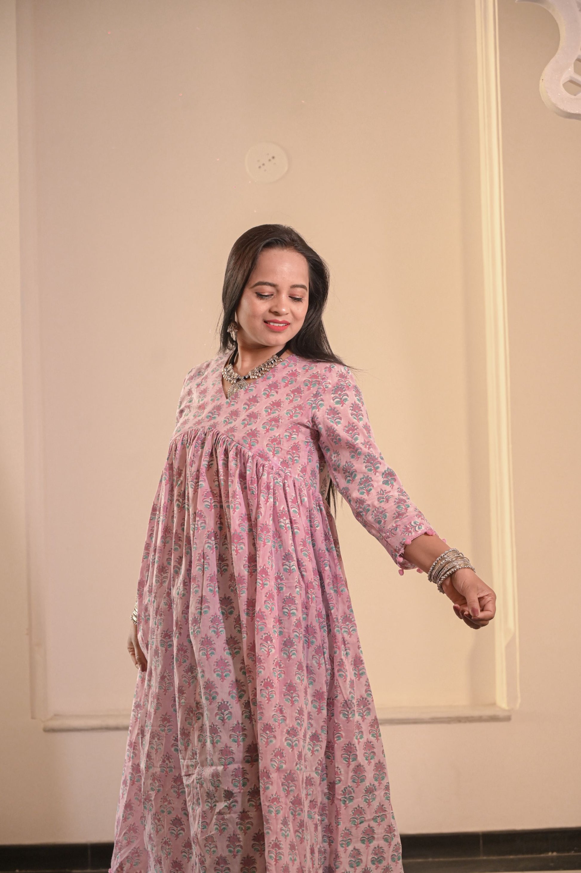 Product Details - The Feriha Lilac Handblock Mulmul Kurta Set showcases a sanganeri handblock printed kurta with small buti motifs in soft lavender shade. The mulmul fabric of the kurta makes it extremely soft to feel and adds to its elegance. The Kurta is stitched in gathers making it flare ready and is embellished with pink pom pom laces which add the perfect touch to the outfit. The set comes with matching cotton pants with pockets on both sides to complete the whole look.