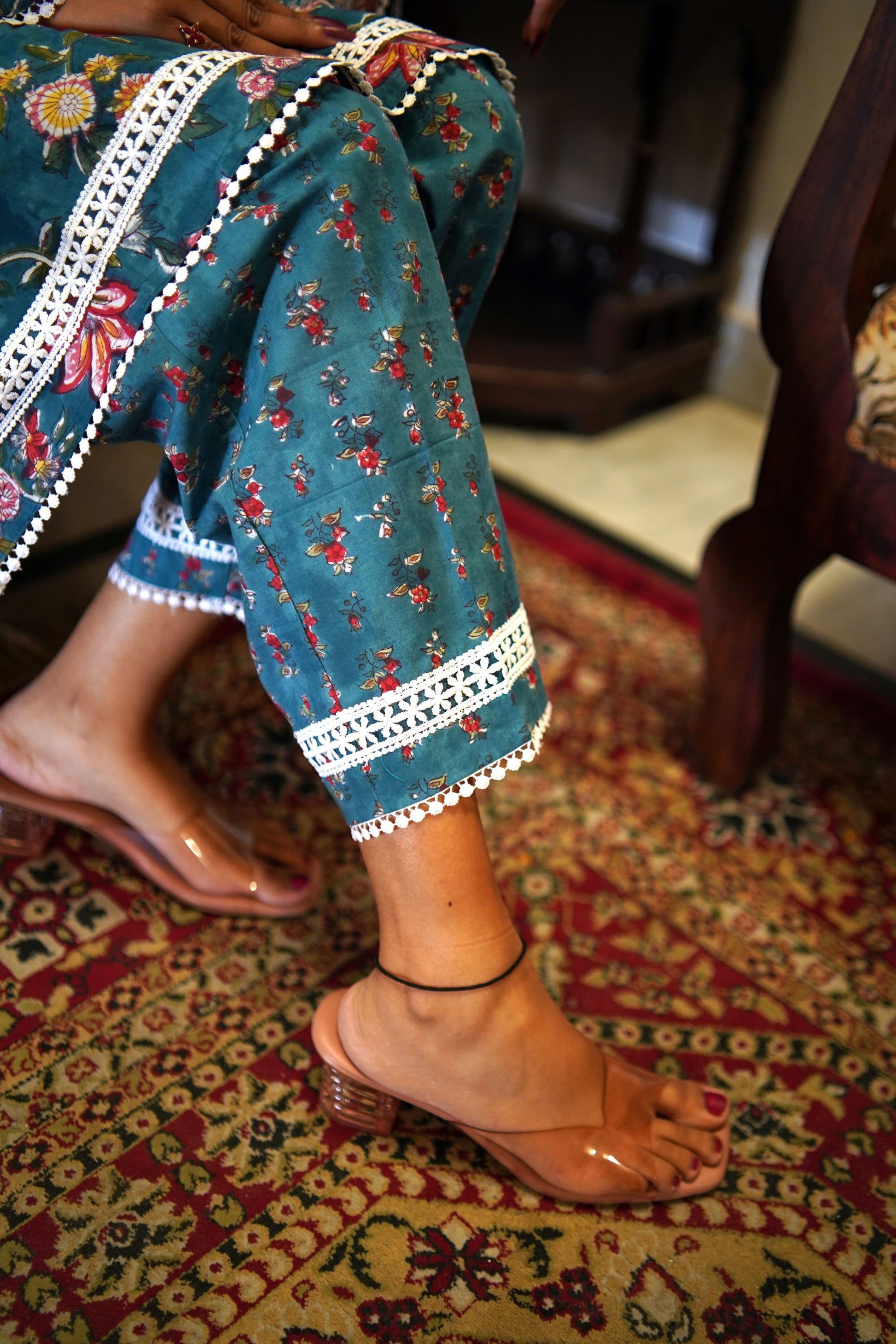 Product Details- The Nazakat Green Handblock Kurta Set Showcases a Green Handblock printed Kurta with Floral Jaal pattern. The kurta has a trendy v neckline and flared sleeves which give it modern stylish look and it comes with matching cotton pants. The kurta and the pant both have intricate Crochia Lace work . The floral Jaal print of this set surely wins everyone’s heart.