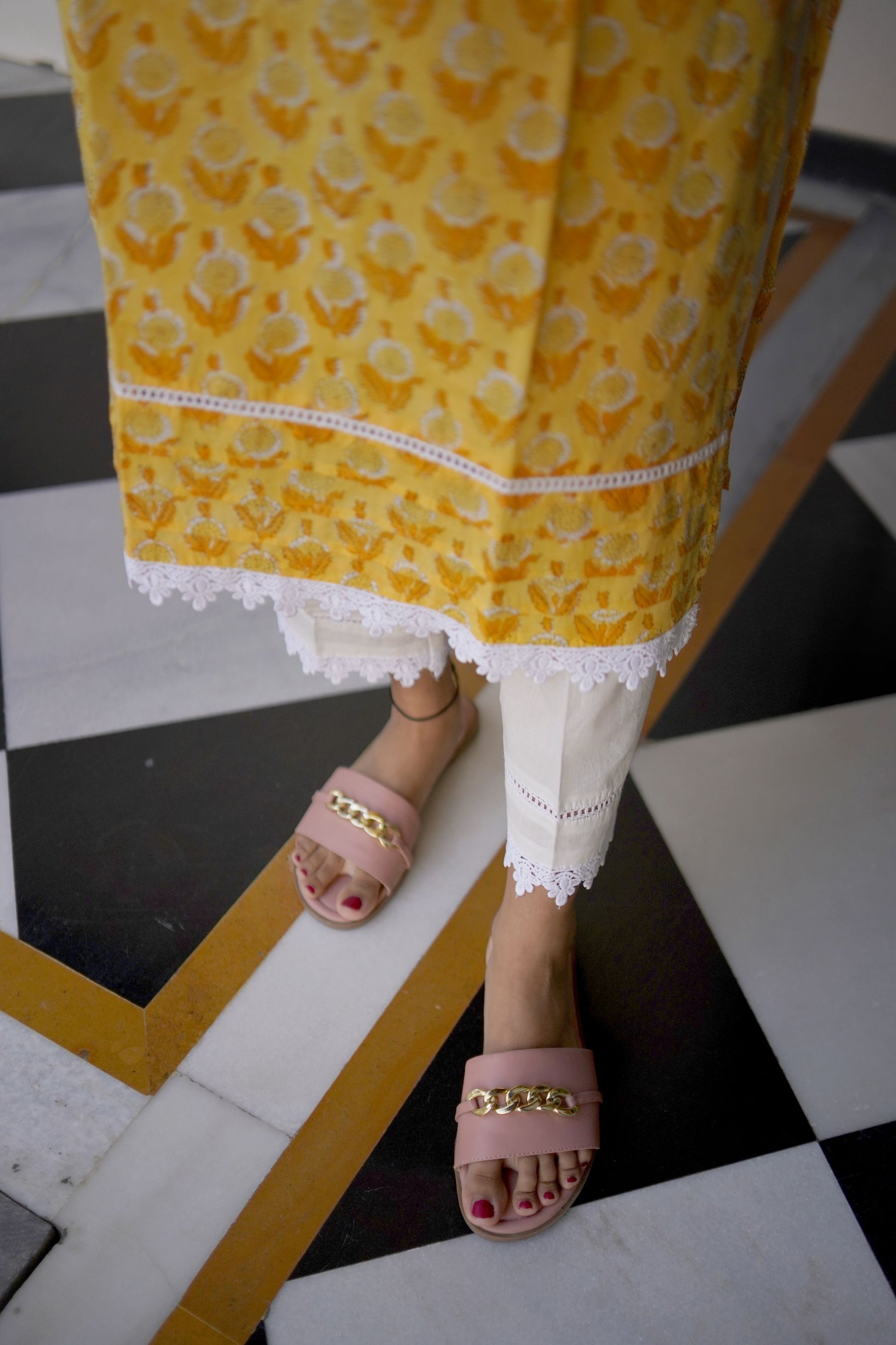 Product Details- The Seher Yellow Handblock Kurta Set showcases a beautiful yellow sanganeri handblock kurta with trendy flared sleeves stitched in a straight silhouette .The kurta and pants both have beautiful detailed crochia lace work. This set is super trendy and comfortable to wear . The colour of this set will surely brighten up your day.